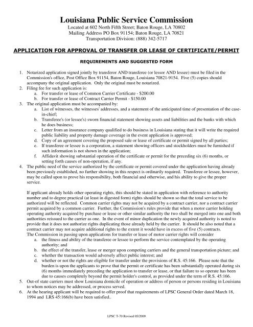 Transfer Or Lease Of Certificate Permit Louisiana Public Service